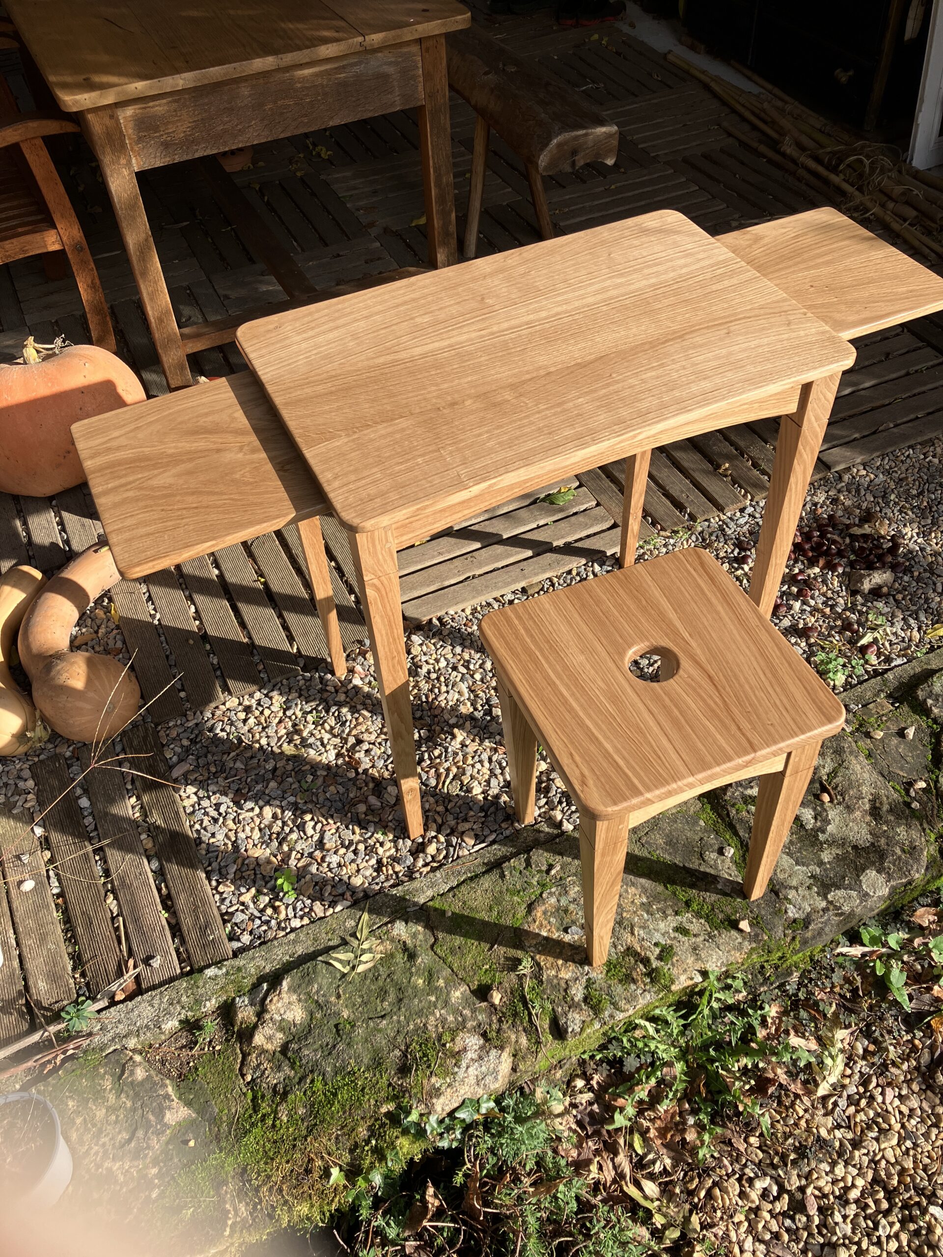 Table avec tablettes rétractables et tabouret assorti, chêne massif.Cabinet sur piètement d’inspiration Japonaise.Bureau semi-angle, dessus en placage décoratif, structure en chêne, côté plaqué en mosaïque.Un coffre de pied-de-lit, chêne massif et décors à l’ébonisation.Buffet marqueté à tiroirs et panneaux coulissants, chêne, châtaignierDuo de chevets en chêne et châtaignier, finition cire d’abeille et carnauba.Bibliothèque courbe, sapin et finition huile blanchie.Petite table pliante, chêne massif et huile-cire.Meuble étroit à rideau pour des sanitaires, bâti en chêne, porte coulissante en lamelles de châtaignier. Berceau d’enfant, devenu coffre à jouets, sapin ajouré, montage chevillé, entièrement démontable.Table d’appoint pour une bergère (fauteuil), chêne massif et laçage cuir.Cabinet à abattant en frêne, marqueterie de frêne et noyer, compartiment caché, enceinte passive pour smartphone.Valisette en châtaignier, poignées en cuir, gravure personnalisée.Pied sculpté et brûlé « yakisugi » pour une table d’exposition.Boîte à couture, deux casiers, chêne et châtaignier