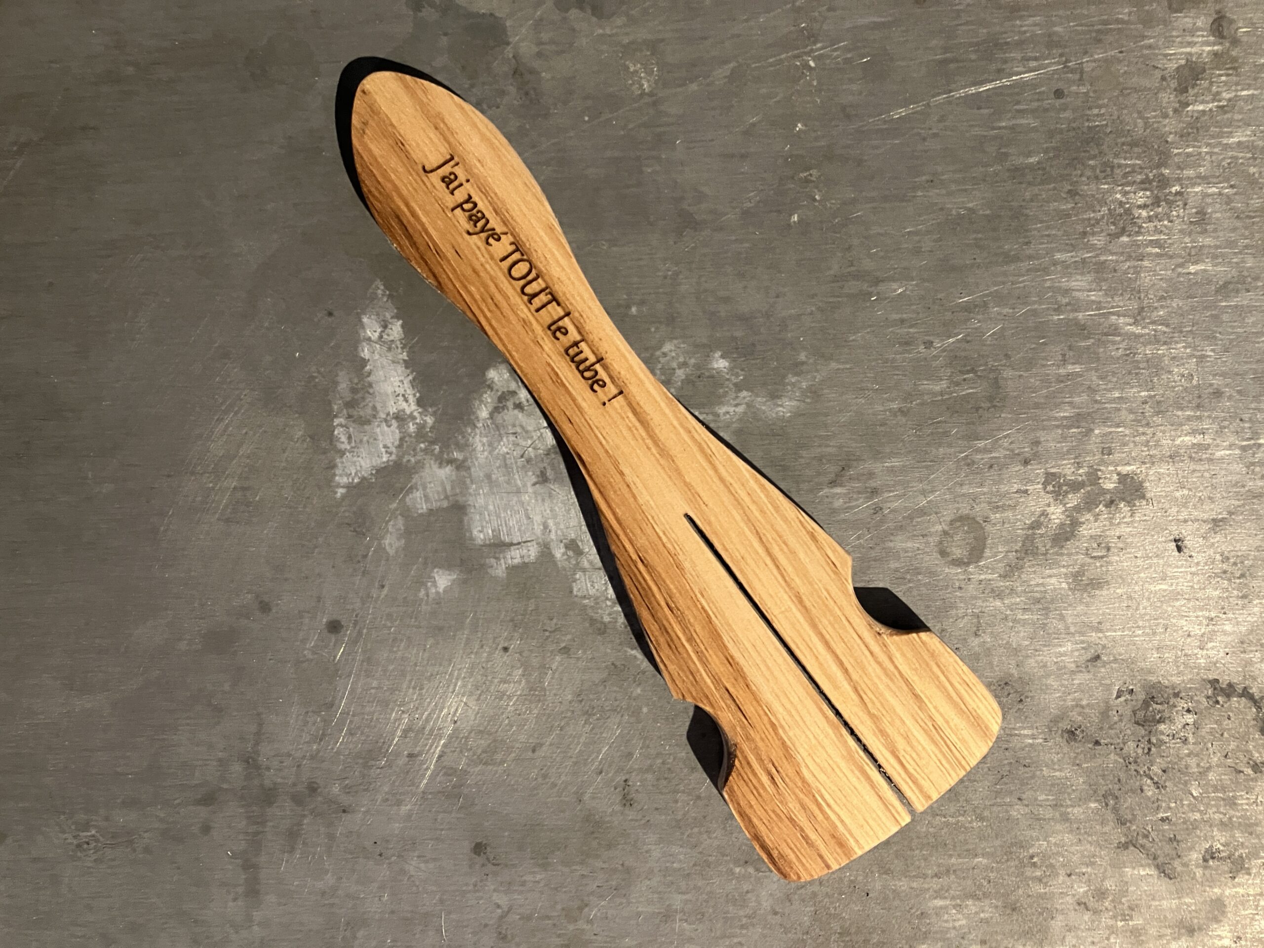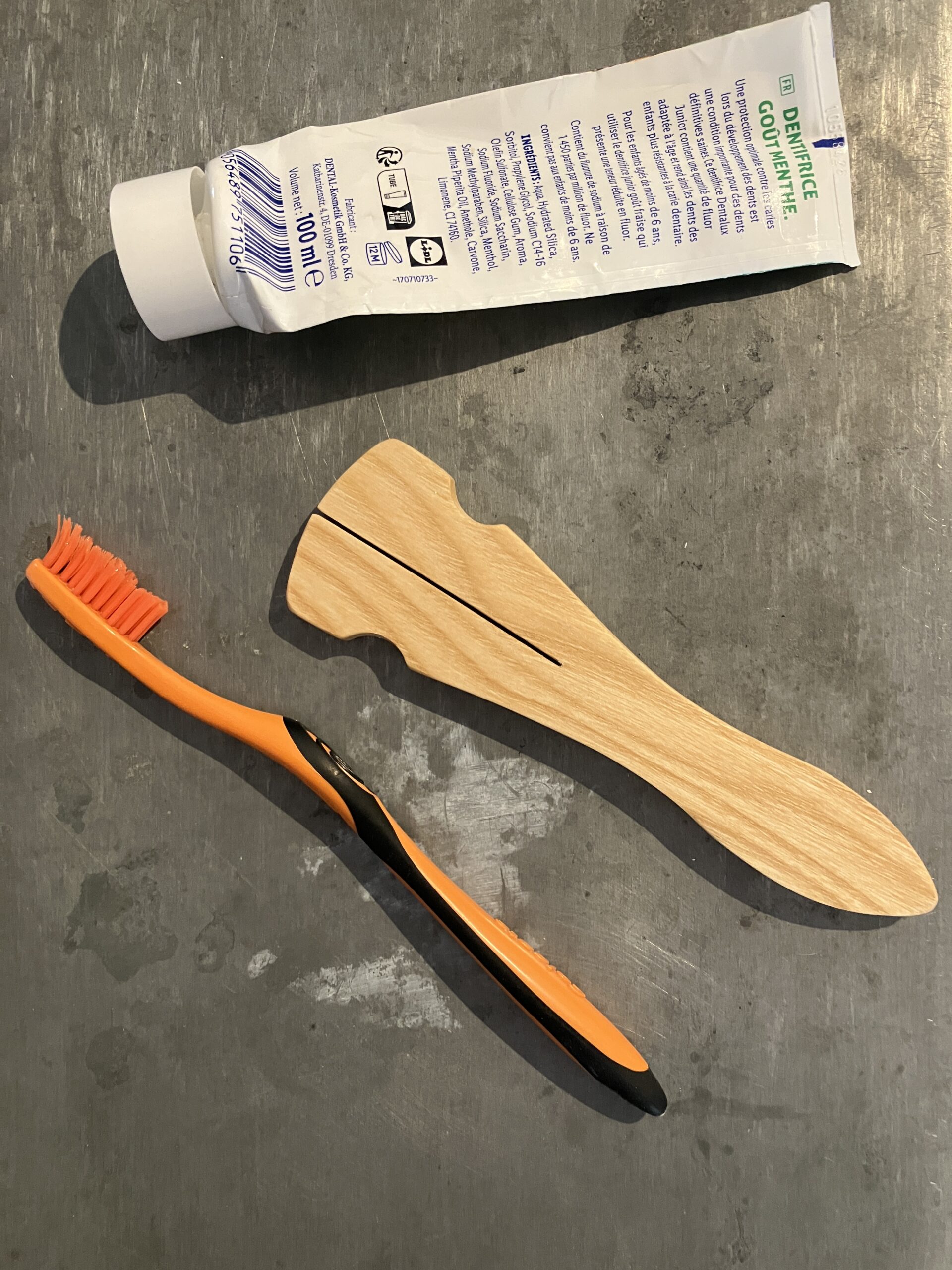 Grâce à ce vide-tube en bois, frêne, chêne ou châtaignier selon les disponibilités, vous pourrez extraire la substantifique pâte à dent d’une seule main, et la déposer délicatement sur votre brosse à dent tenue dans l’autre main ! Cela ne vous rendra pas millionnaire, mais au moins, vous préserverez un peu la planète : une tube qui dure plus longtemps = moins de tubes à acheter = moins de déchets plastique !